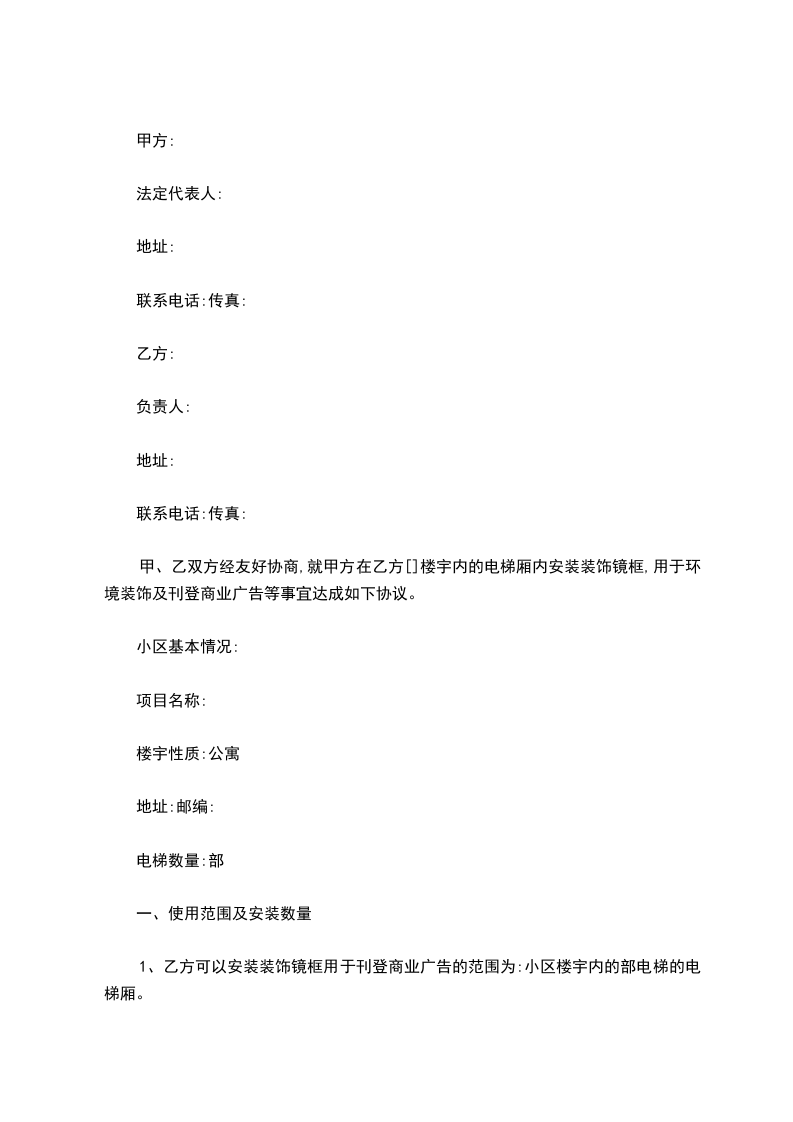 甲、乙双方经友好协商,就[ 水岸欧韵一期 ]楼宇内的一至三栋楼内的电梯厢用于环境装饰及刊登广告等事宜达成如下协议。