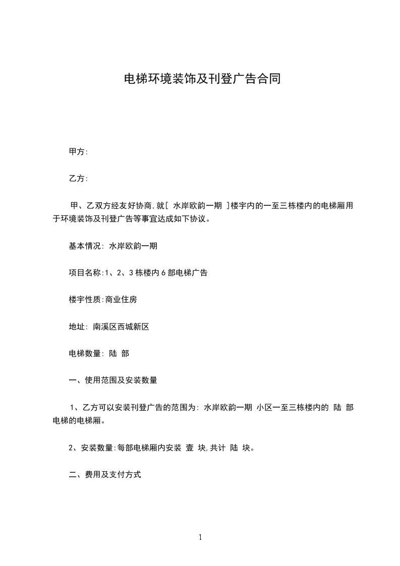 1、乙方可以安装刊登广告的范围为: 水岸欧韵一期 小区一至三栋楼内的 陆 部电梯的电梯厢。