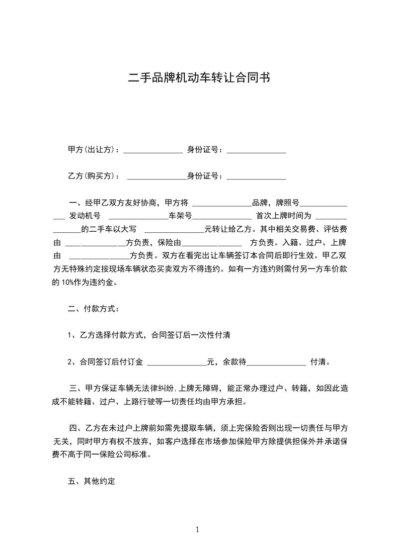 一、经甲乙双方友好协商,甲方将 _______________品牌,牌照号_______________ 发动机号 _______________车架号_______________ 首次上牌时间为 _______________的二手车以大写 _______________元转让给乙方。其中相关交易费、评估费由 _______________方负责,保险由_______________ 方负责。入籍、过户、上牌由 _______________方负责。双方在看完出让车辆签订本合同后即行生效。甲乙双方无特殊约定按现场车辆状态买卖双方不得违约。如有一方违约则需付另一方车价款的10%作为违约金。
