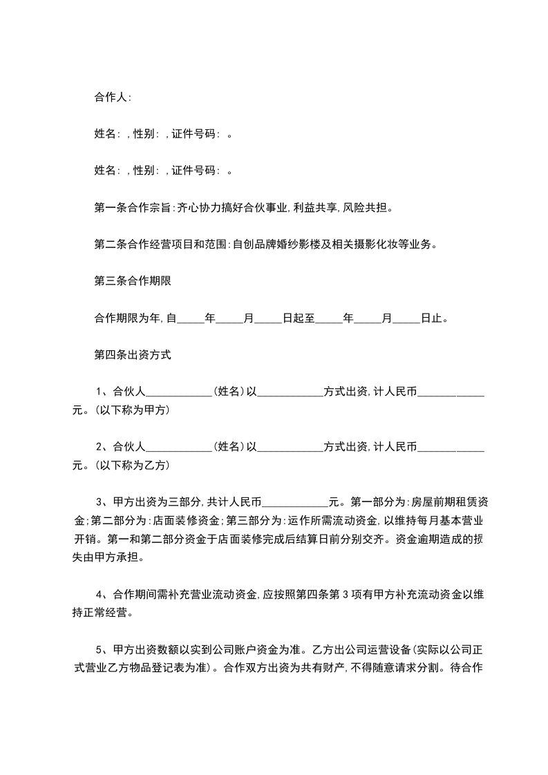 第二条合作经营项目和范围:自创品牌婚纱影楼及相关摄影化妆等业务。