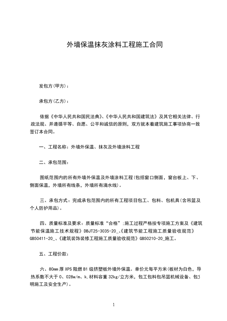 六、80mm厚XPS阻燃B1级挤塑板外墙外保温。单价元每平方米(板材为白色,导热系数不大于0、028w/m、k,材料容重32kg/立方米,包工包料包吊篮机械设备、包文明施工及安全生产)。