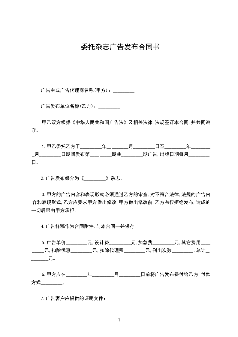 1.甲乙委托乙方于_________年_________月_________日至_________年_________月_________日期间发布第_________期共_________期广告,出版日期每月_________日。