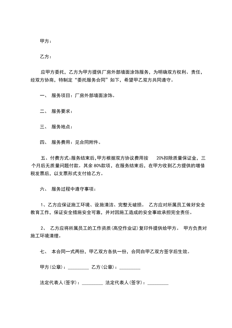 应甲方委托,乙方为甲方提供厂房外部墙面涂饰服务,为明确双方权利、责任,经双方协商,特制定“委托服务合同”如下,希望甲乙双方共同遵守。
