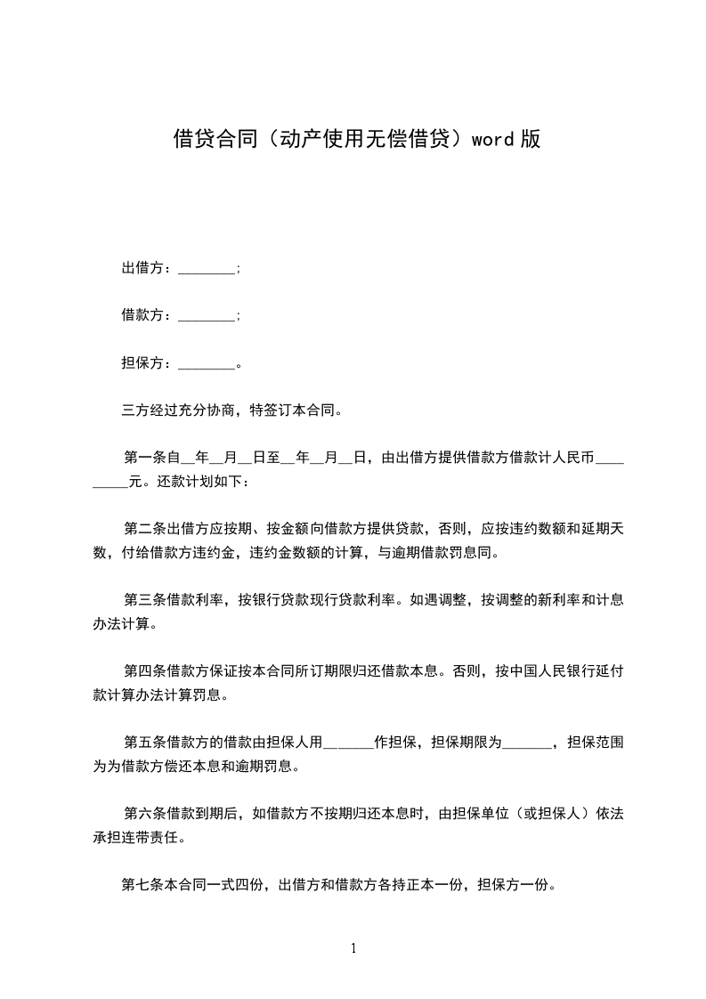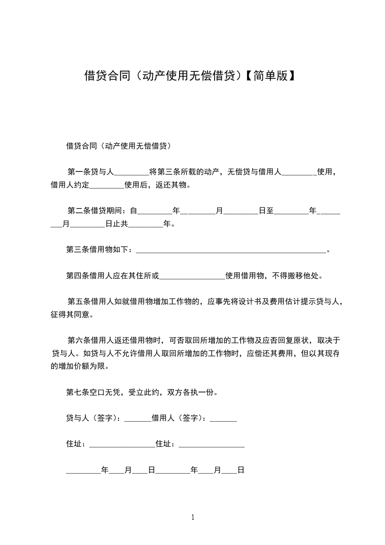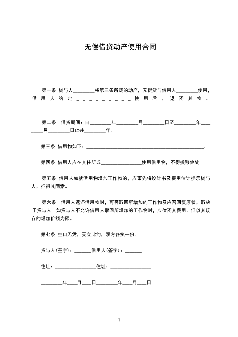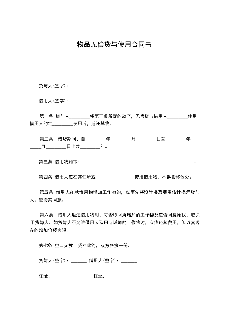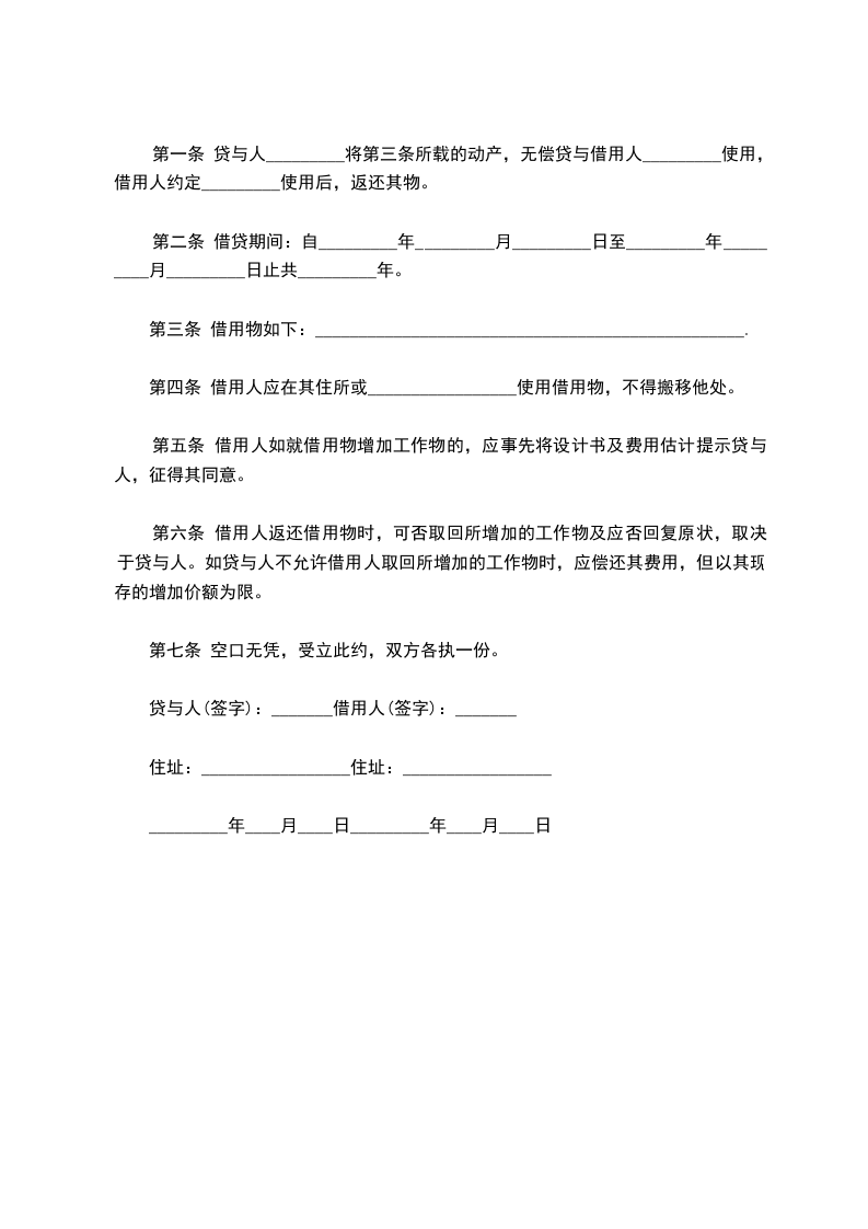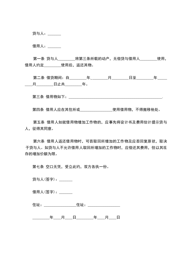 第一条 贷与人_________将第三条所载的动产,无偿贷与借用人_________使用,借用人约定_________使用后,返还其物。