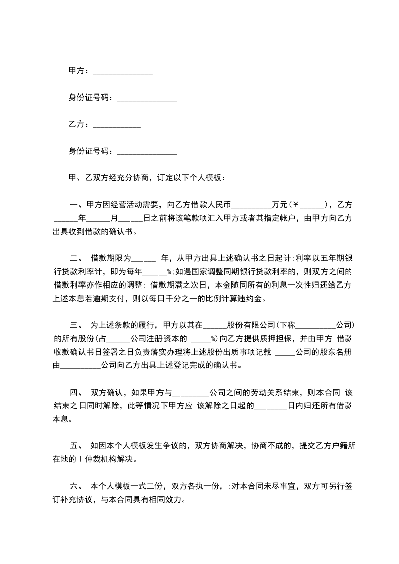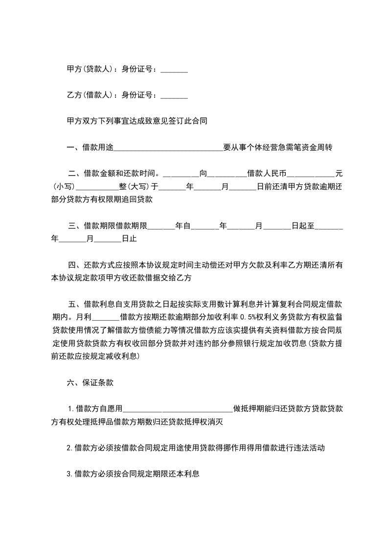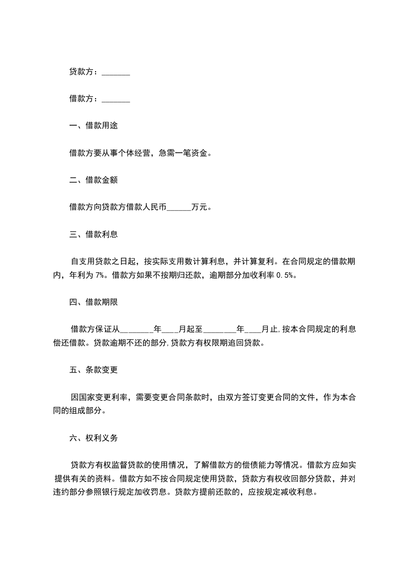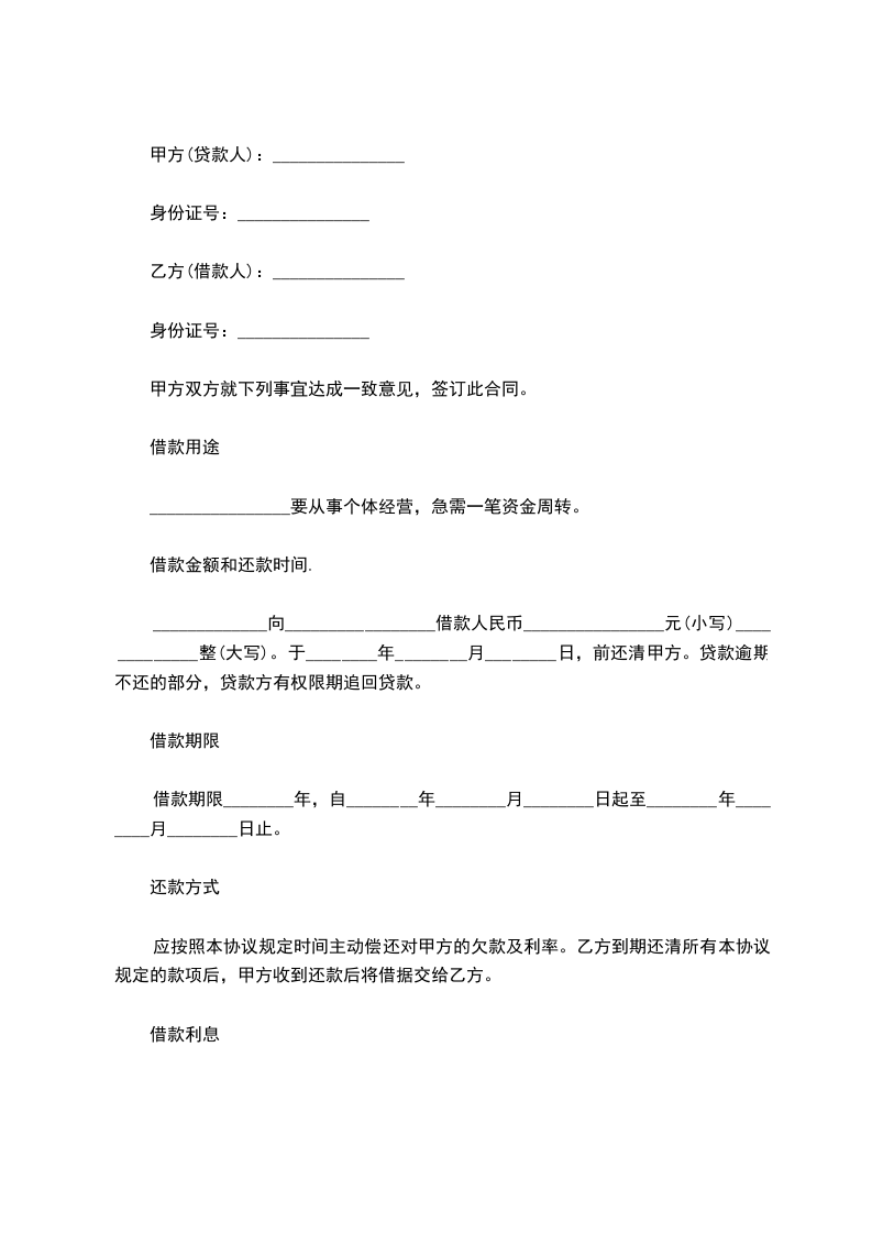 _____________向_________________借款人民币________________元(小写)_____________整(大写)。于________年________月________日,前还清甲方。贷款逾期不还的部分,贷款方有权限期追回贷款。