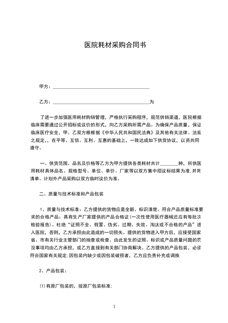 三、质量保证:_________________乙方提供的医用耗材必须符合医用耗材质量标准,并具有医用耗材生产企业质检部门医用耗材检验报告书。进口医用耗材须有进口医用耗材注册证和口岸药检所的检验报告书。乙方所提供的医用耗材在有效期内出现质量问题,要按质量承诺,由乙方负责退货,应承担相应责任。