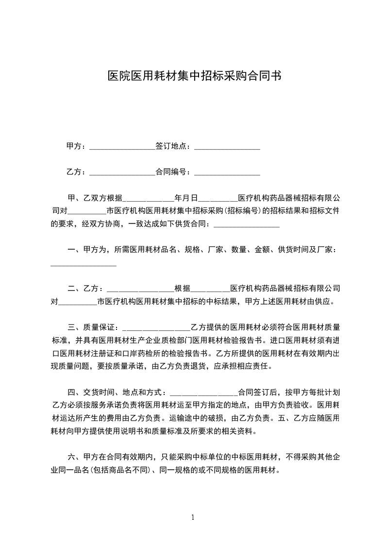 甲、乙双方根据__________________年_____月_____日__________医疗机构药品器械招标有限公司对__________市医疗机构医用耗材集中招标采购(招标编号)的招标结果和招标文件的要求,经双方协商,一致达成如下供货合同:_________________