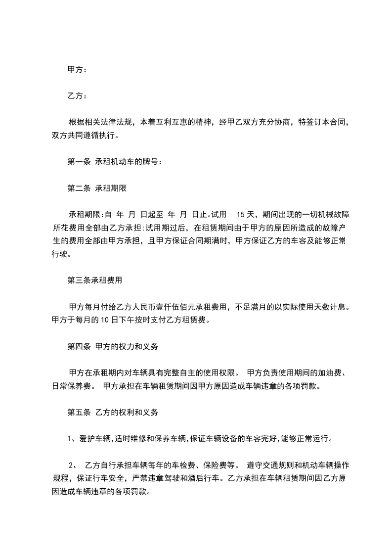 承租期限:自 年 月 日起至 年 月 日止。试用15天,期间出现的一切机械故障所花费用全部由乙方承担;试用期过后,在租赁期间由于甲方的原因所造成的故障产生的费用全部由甲方承担,且甲方保证合同期满时,甲方保证乙方的车容及能够正常行驶。