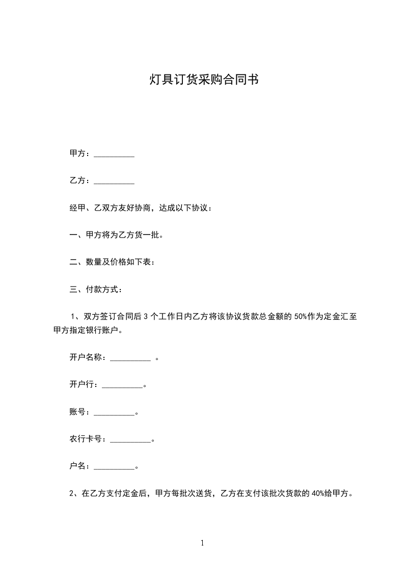 1、双方签订合同后3个工作日内乙方将该协议货款总金额的50%作为定金汇至甲方指定银行账户。