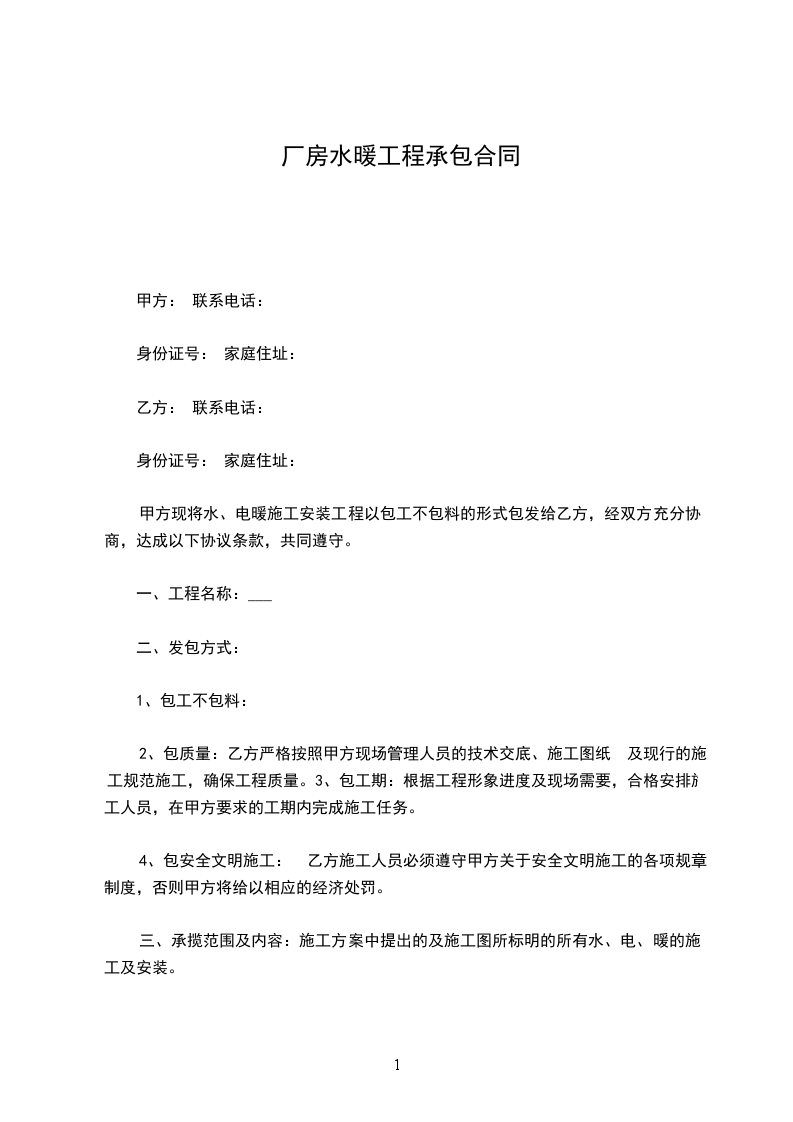 甲方现将水、电暖施工安装工程以包工不包料的形式包发给乙方,经双方充分协商,达成以下协议条款,共同遵守。