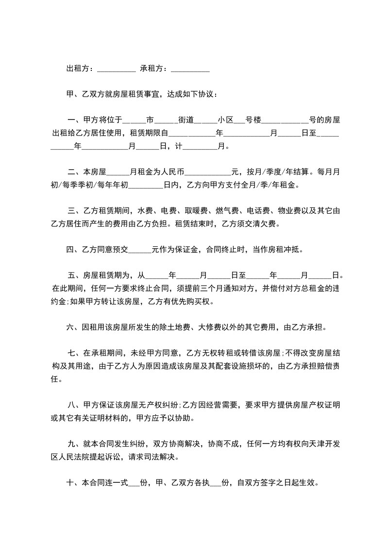 2.合同签订之日,乙方应向甲方支付人民币_____元整(小写:¥元)作为租赁保证金,租赁期满时乙方如不再续租,且乙方无任何违约行为时,甲方将该保证金全部无息退还给乙方。