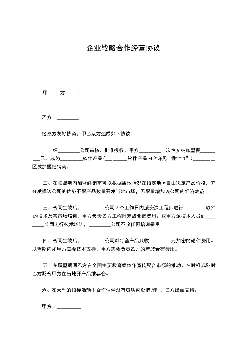 一、经_________公司审核、批准授权,甲方_________一次性交纳加盟费_________元,成为_________软件产品(_________软件产品内容详见“附件1”)_________区域加盟经销商。