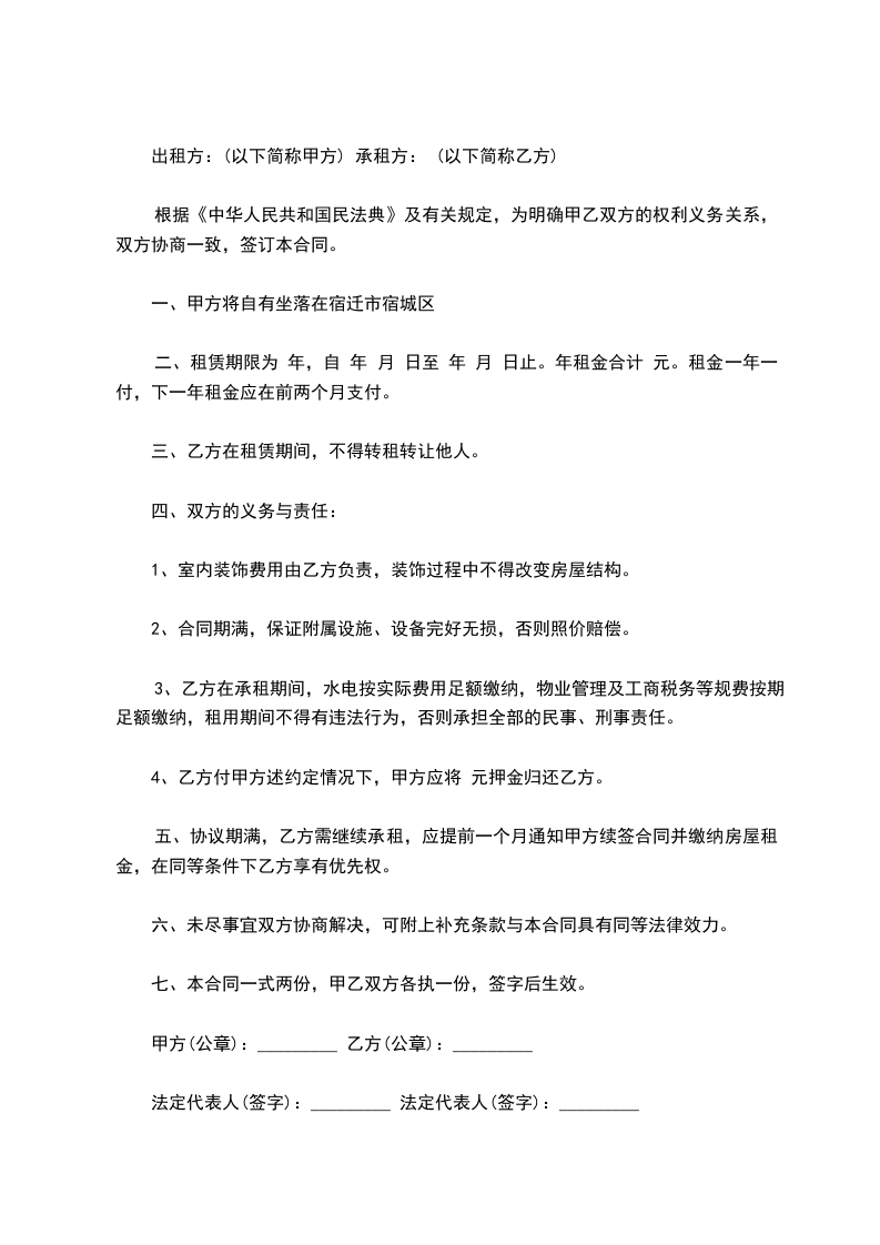 二、租赁期限为 年,自 年 月 日至 年 月 日止。年租金合计 元。租金一年一付,下一年租金应在前两个月支付。