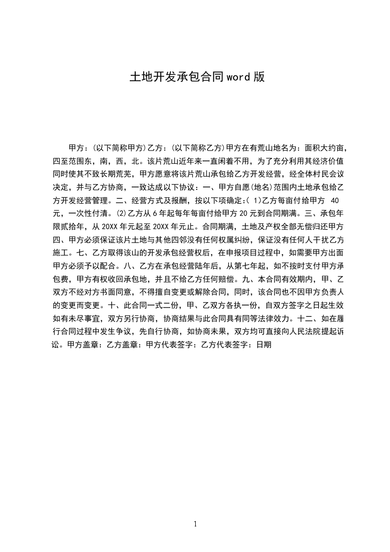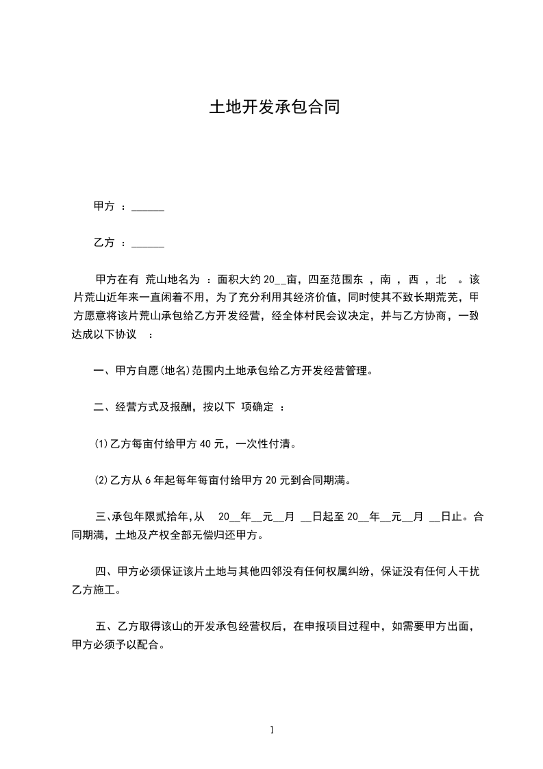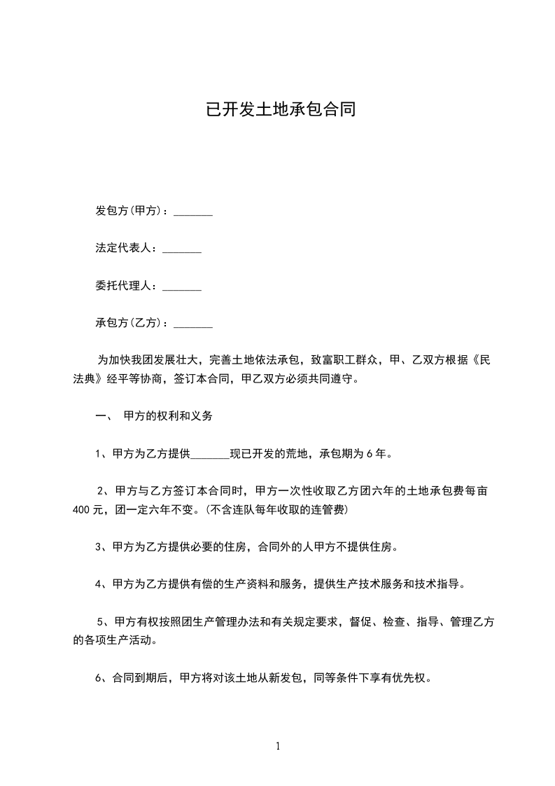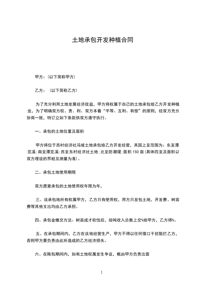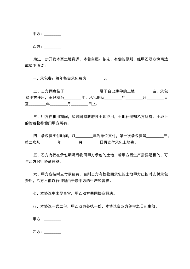 为进一步开发本寨土地资源,本着自愿、依法,有偿的原则,经甲乙双方协商达成如下协议: