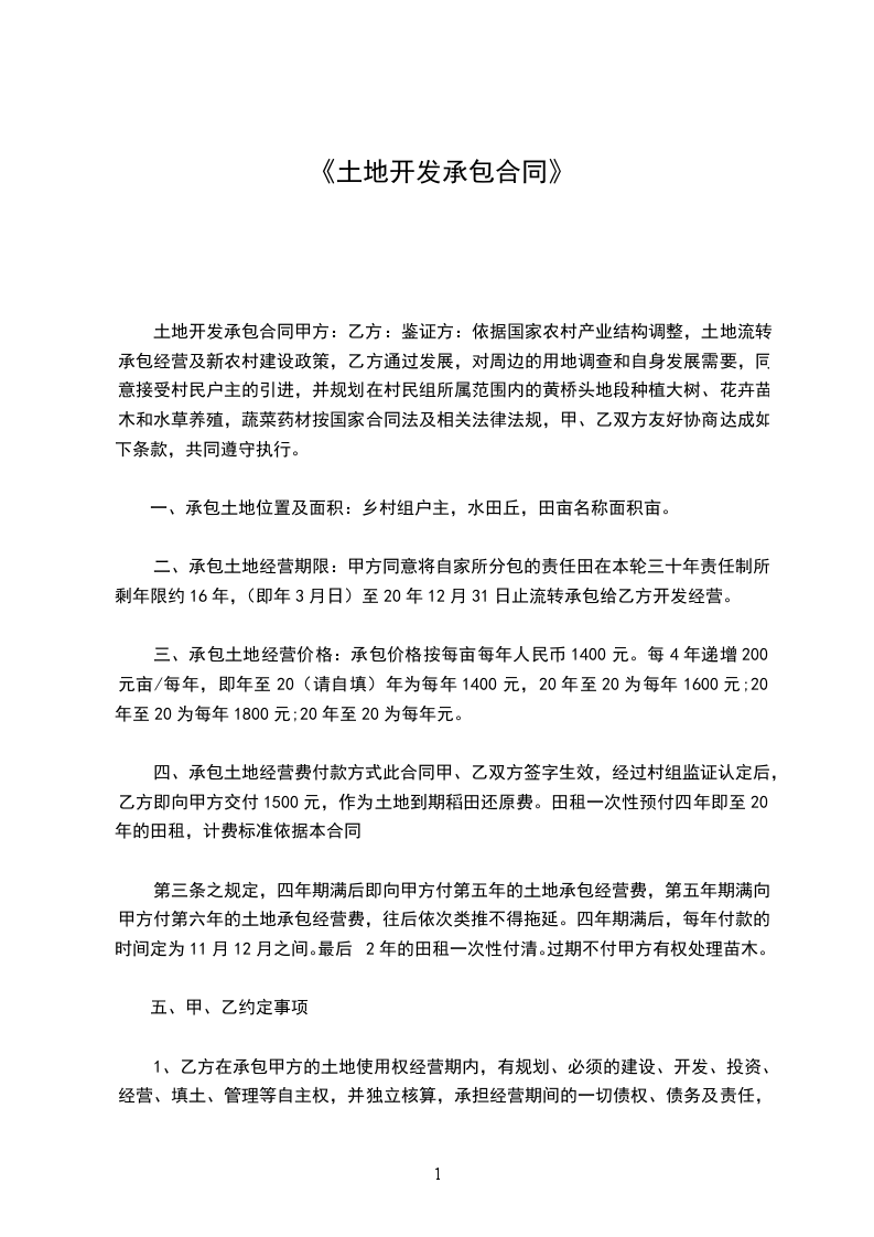 一、承包费:每年每亩承包费为_________元