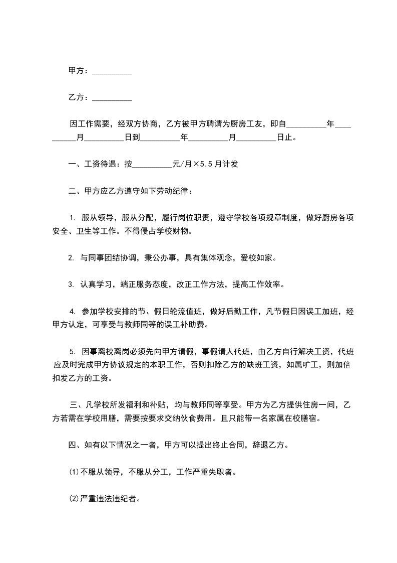 因工作需要,经双方协商,乙方被甲方聘请为厨房工友,即自__________年__________月__________日到__________年__________月__________日止。