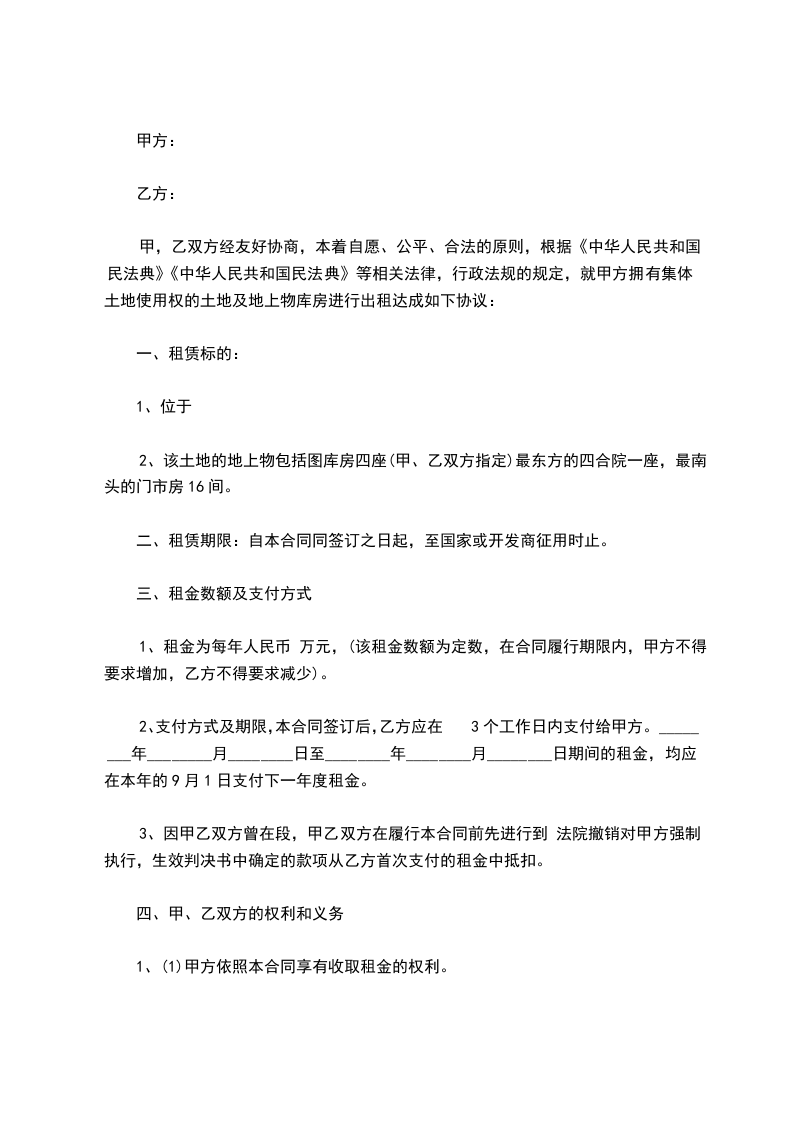 甲,乙双方经友好协商,本着自愿、公平、合法的原则,根据《中华人民共和国民法典》《中华人民共和国民法典》等相关法律,行政法规的规定,就甲方拥有集体土地使用权的土地及地上物库房进行出租达成如下协议: