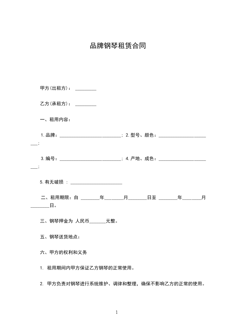 一、租用内容:钢琴________台, 品牌________;型号________;价值________元
