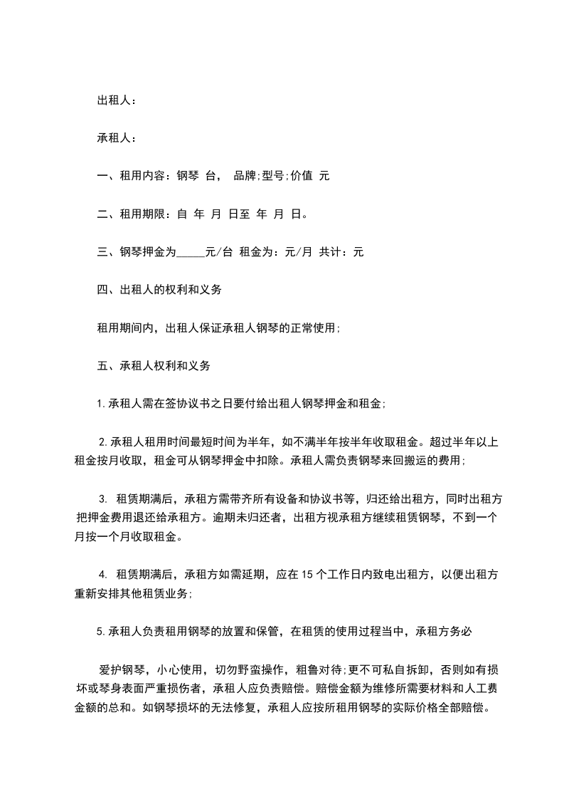 1.承租人需在签协议书之日要付给出租人钢琴押金和租金;