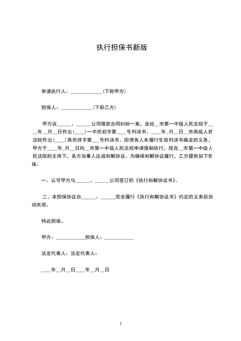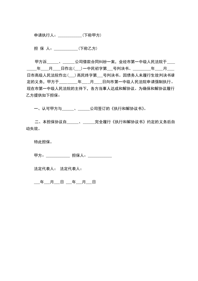 甲方诉______、______公司借款合同纠纷一案,业经市第一中级人民法院于_________年____月____日作出(___)一中民初字第___号判决书、_________年____月____日市高级人民法院作出(___)高民终字第___号判决书。因债务人未履行生效判决书确定的义务,甲方于_________年____月____日向市第一中级人民法院申请强制执行。现在市第一中级人民法院的主待下,各方当事人达成和解协议。为确保和解协议履行,乙方提供如下担保: