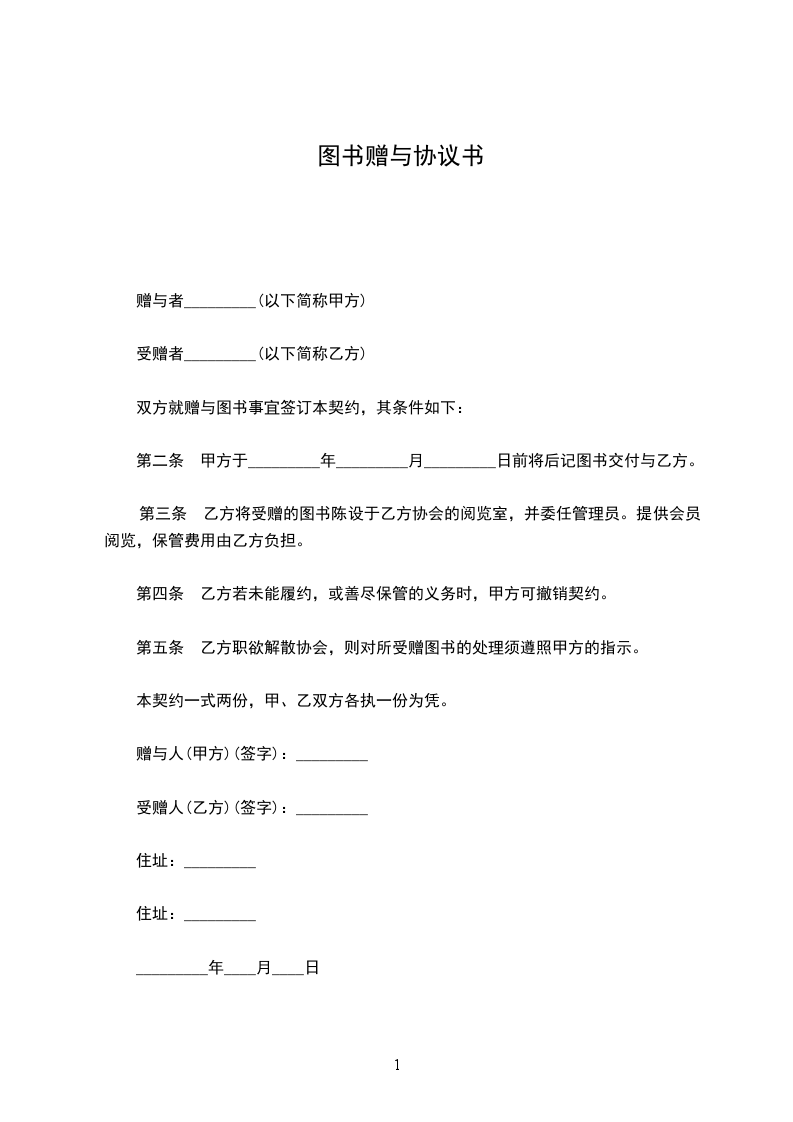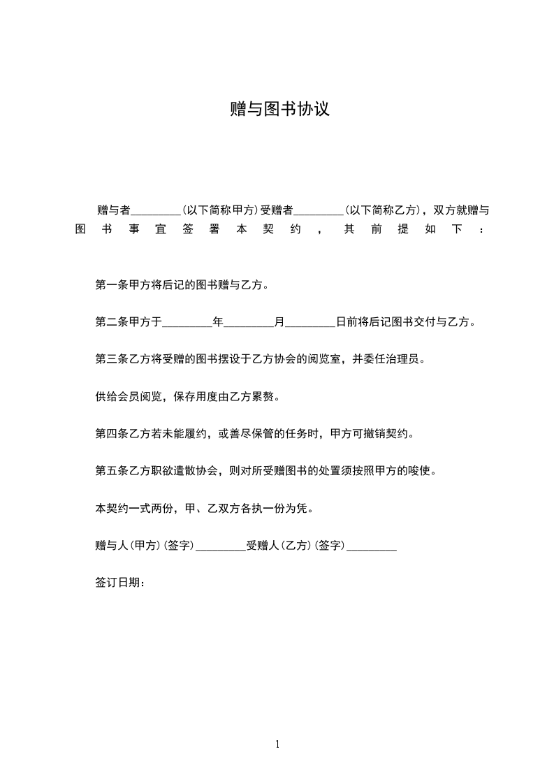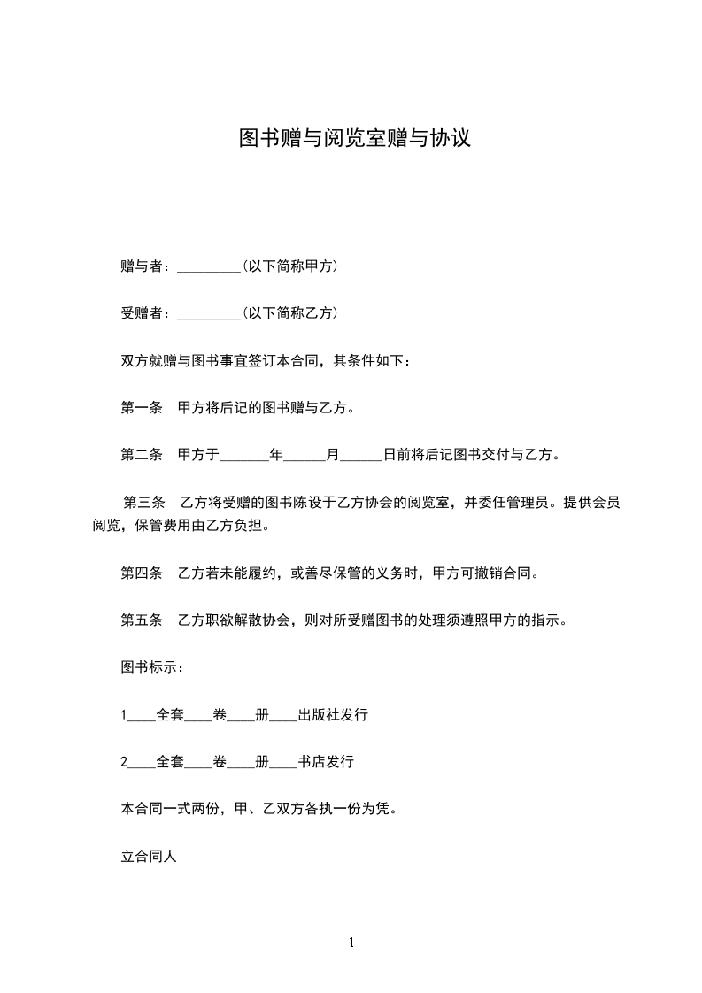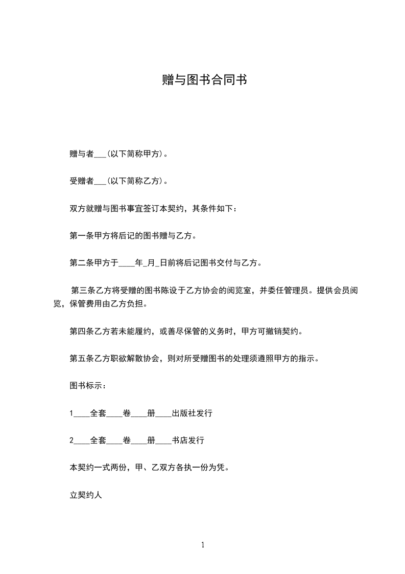 双方就赠与图书事宜签订本契约,其条件如下: