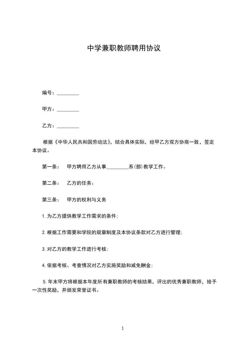 5.年末甲方将根据本年度所有兼职教师的考核结果,评出的优秀兼职教师,给予一次性奖励,并颁发荣誉证书。