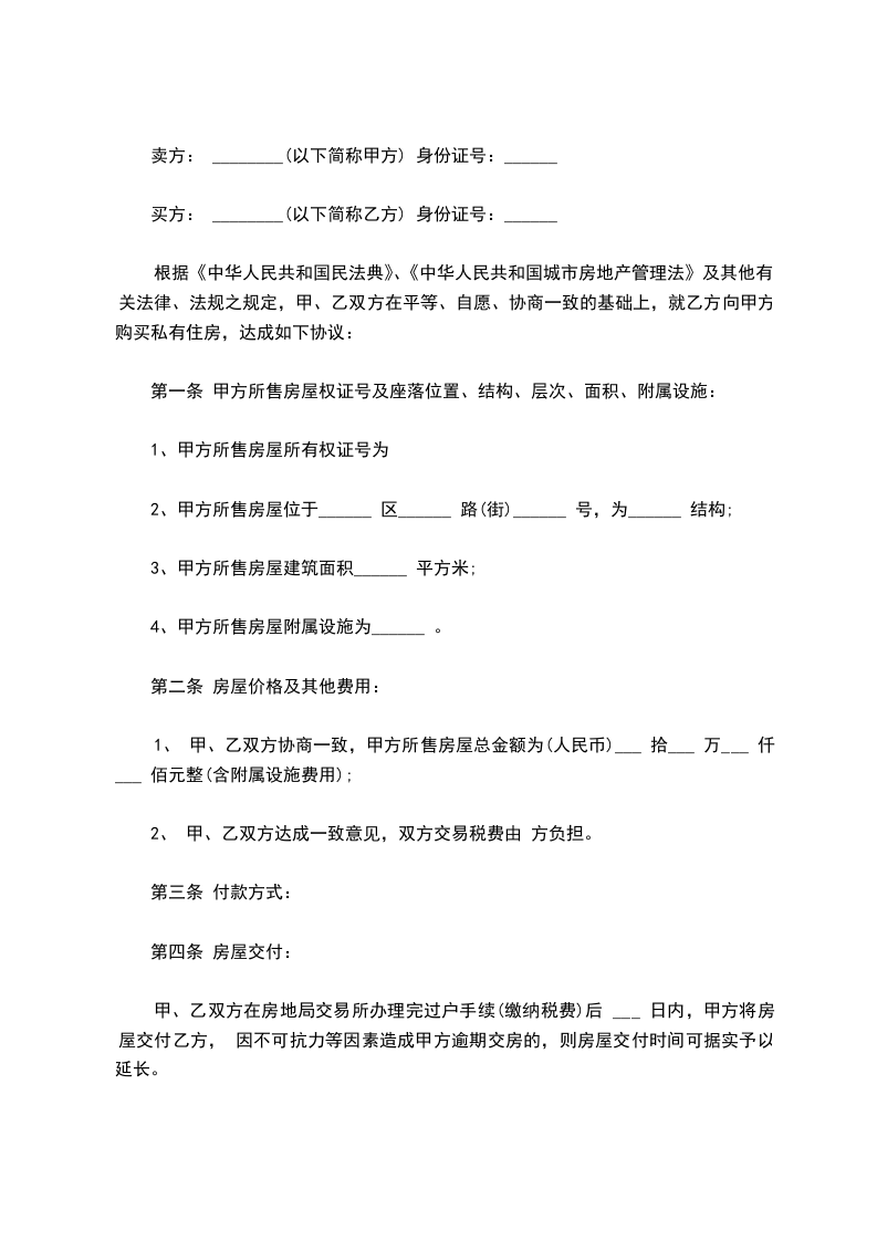 根据《中华人民共和国民法典》、《中华人民共和国城市房地产管理法》及其他有关法律、法规之规定,甲、乙双方在平等、自愿、协商一致的基础上,就乙方向甲方购买私有住房,达成如下协议: