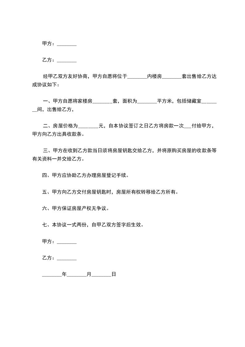 1、 甲、乙双方协商一致,甲方所售房屋总金额为(人民币)___ 拾___ 万___ 仟___ 佰元整(含附属设施费用);