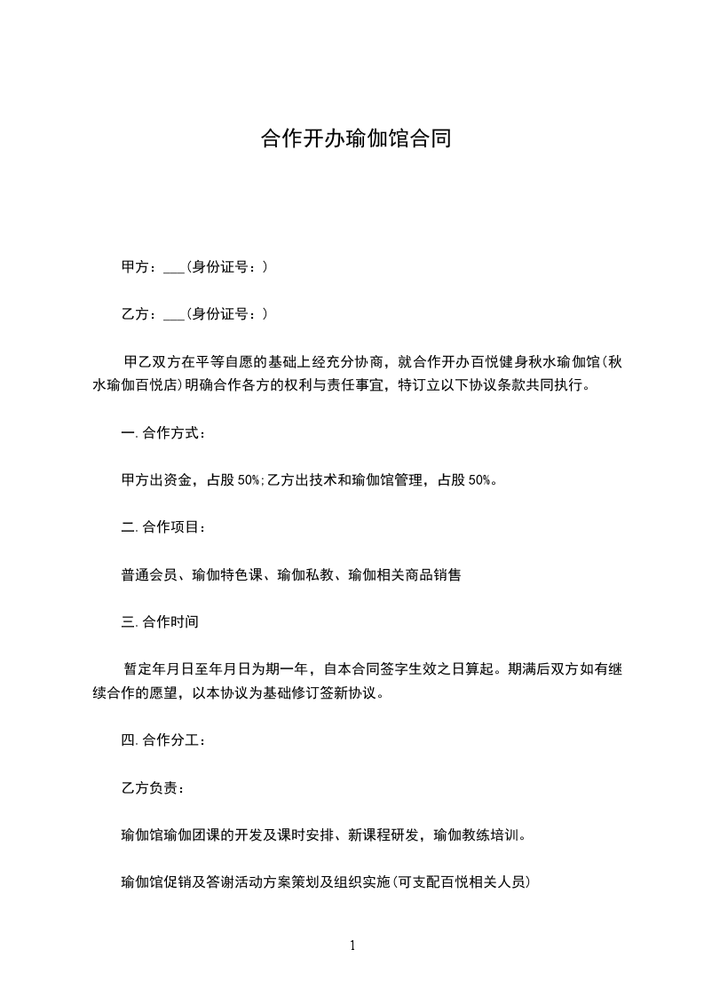 甲乙双方在平等自愿的基础上经充分协商,就合作开办百悦健身秋水瑜伽馆(秋水瑜伽百悦店)明确合作各方的权利与责任事宜,特订立以下协议条款共同执行。