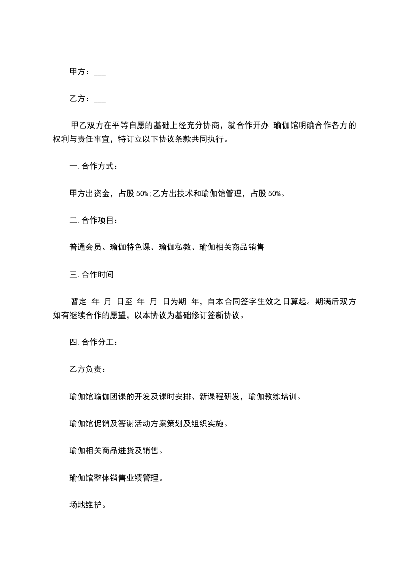 2.瑜伽授课原因造成的会员不满由乙方负责,财务造成的呆账由甲方负责。