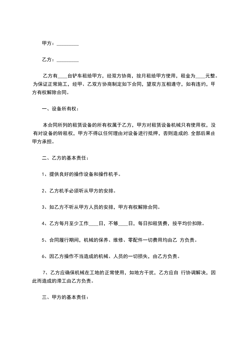 1、乙方以月租形式将机械设备租给甲方,月租金为人民币大写:捌仟元/月,租赁期间设备操作司机工资由甲方支付,工资标准以甲方工资标准为准。