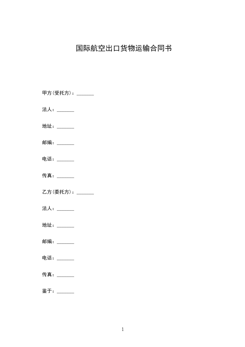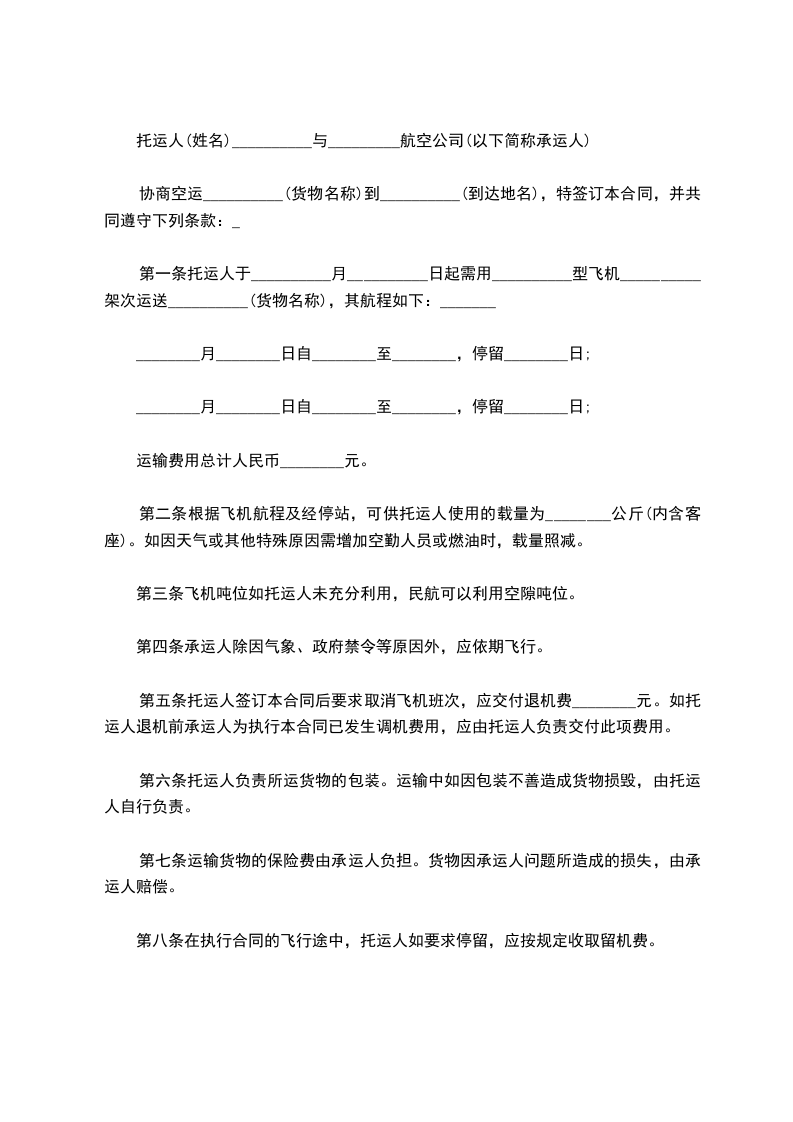 托运人(姓名)__________与中国民用航空__________航空公司(以下简称承运人)协商空运__________(货物名称)到__________(到达地名),特签订本合同,并共同遵守下列条款: