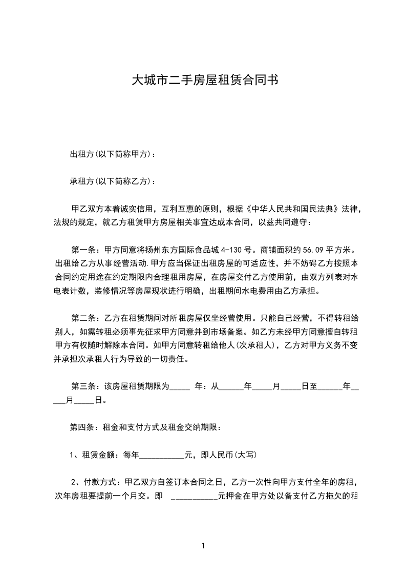 第一条:甲方同意将扬州东方国际食品城4-130号。商铺面积约56.09平方米。出租给乙方从事经营活动.甲方应当保证出租房屋的可适应性,并不妨碍乙方按照本合同约定用途在约定期限内合理租用房屋,在房屋交付乙方使用前,由双方列表对水电表计数,装修情况等房屋现状进行明确,出租期间水电费用由乙方承担。