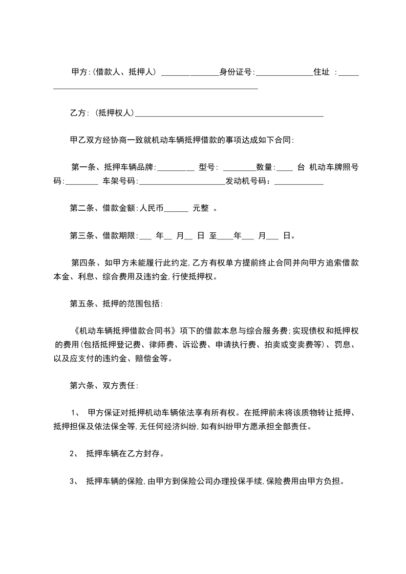 1、 甲方保证对抵押机动车辆依法享有所有权。在抵押前未将该质物转让抵押、抵押担保及依法保全等,无任何经济纠纷,如有纠纷甲方愿承担全部责任。
