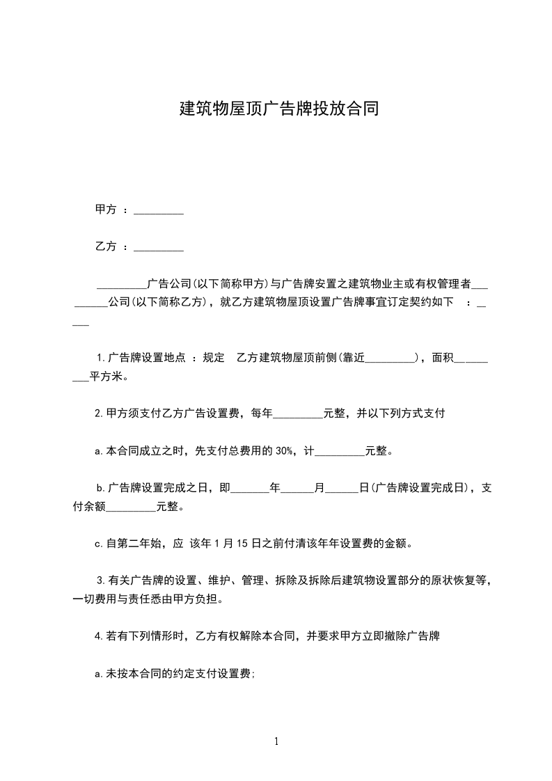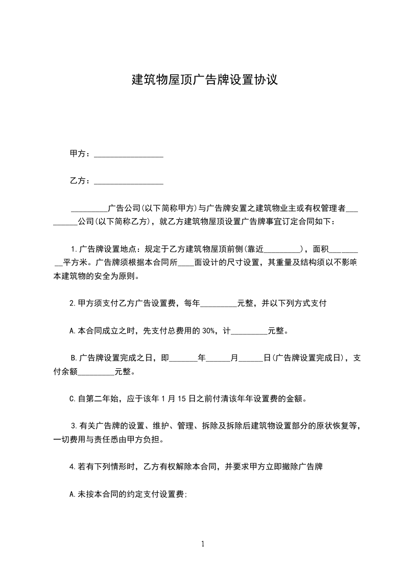 _________广告公司(以下简称甲方)与广告牌安置之建筑物业主或有权管理者_________公司(以下简称乙方),就乙方建筑物屋顶设置广告牌事宜订定契约如下: