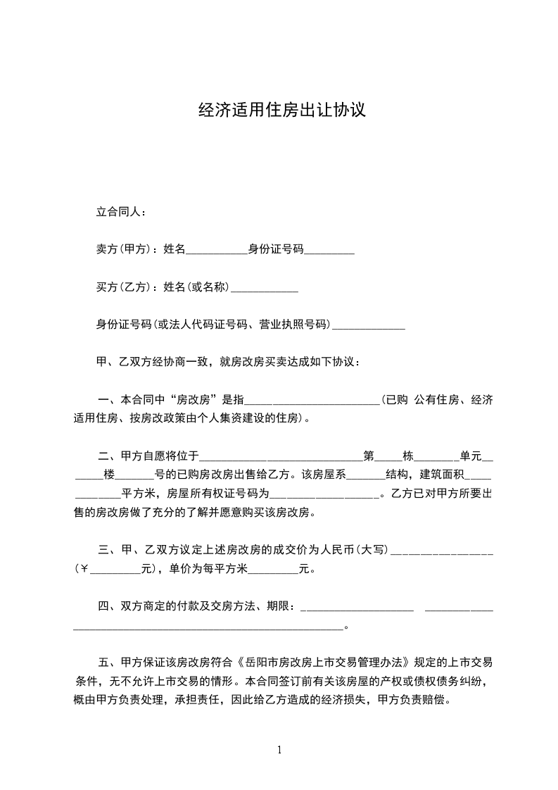 五、甲方保证该房改房符合《岳阳市房改房上市交易管理办法》规定的上市交易条件,无不允许上市交易的情形。本合同签订前有关该房屋的产权或债权债务纠纷,概由甲方负责处理,承担责任,因此给乙方造成的经济损失,甲方负责赔偿。
