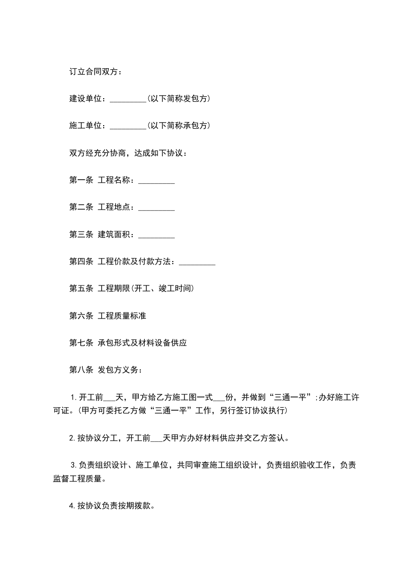 1、开工前______天,发包方给承包方施工图一式______份,并做到“三通一平”;办好施工许可证。(发包方可委托承包方做“三通一平”工作,另行签订协议执行)