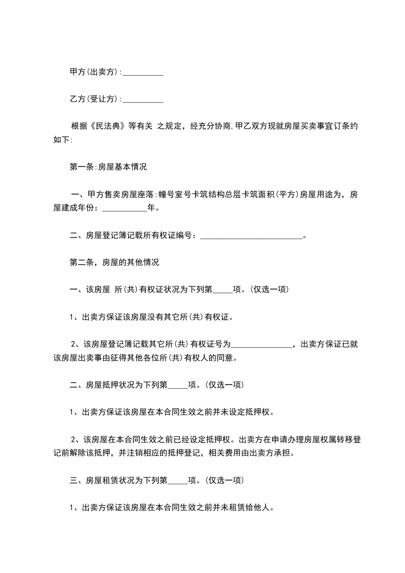 第一条甲方同意将本人坐落在____房屋转让给乙方。房屋建筑面积______平米,房屋所有权证编号____;国有土地使用权证编号____。甲方出售房屋已征得房屋共有人(承租人)的同意,并为此承担相应的法律责任;乙方对上述房屋已经充分了解,同意购买上述房屋。