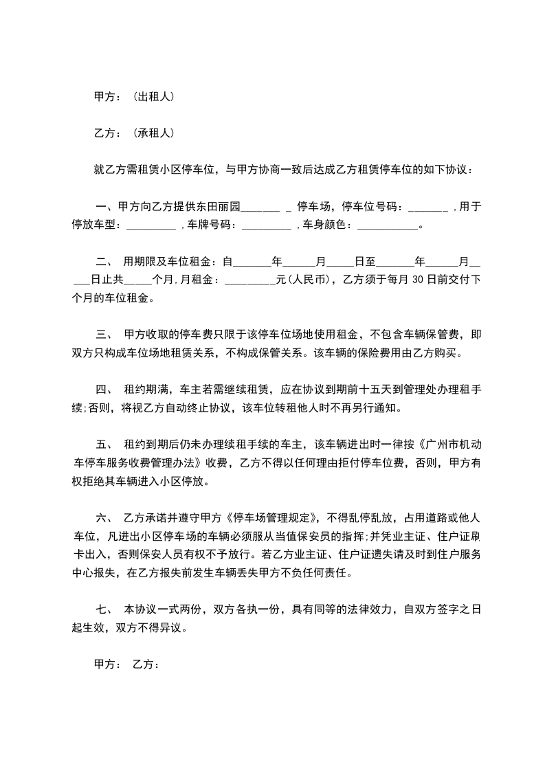 乙方就甲方租用本小区之停车位事宜,达成如下协议,供双方共同遵照执行。