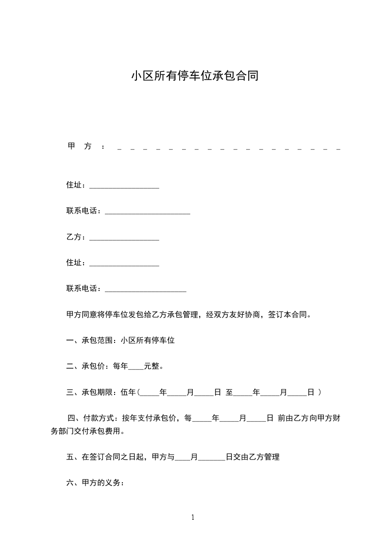 五、本合同有效期 年,即自 年 月 日起至 年 月 日止。甲方如需续租,应当提前一个月向乙方提出要求。租期内因甲方原因要停止使用该车位,甲方应提前一个月通知乙方,否则,已交车位租赁费不予退还;