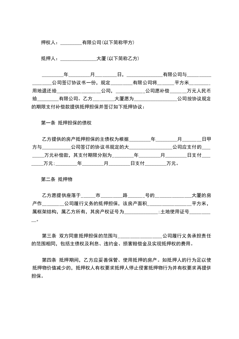 乙方愿提供座落于______市_________路_______号的_______________大厦的房产作_________公司履行义务的抵押担保,该房产面积__________________平方米,属框架结构,属乙方所有,其房产权证号为______________;土地使用证号___________。