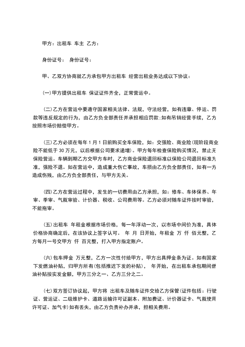 (一)甲方提供出租车 保证证件齐全,正常营运中。