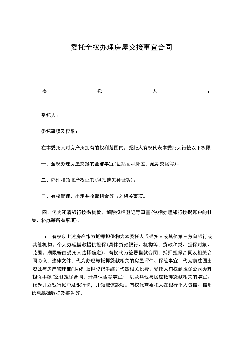 一、全权办理房屋交接的全部事宜(包括面积补差、延期交房等)。