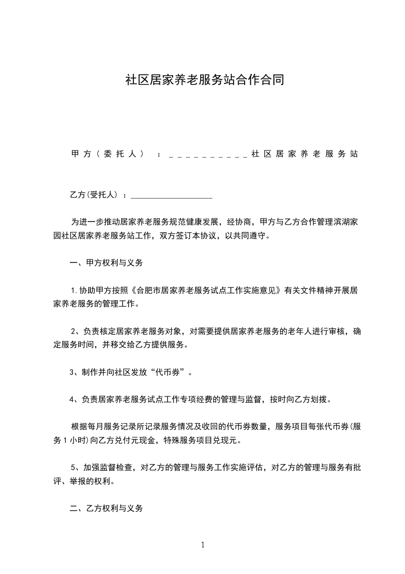 1.协助甲方按照《合肥市居家养老服务试点工作实施意见》有关文件精神开展居家养老服务的管理工作。