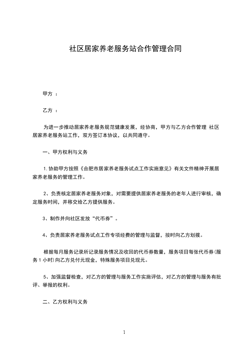为进一步推动居家养老服务规范健康发展,经协商,甲方与乙方合作管理 社区居家养老服务站工作,双方签订本协议,以共同遵守。