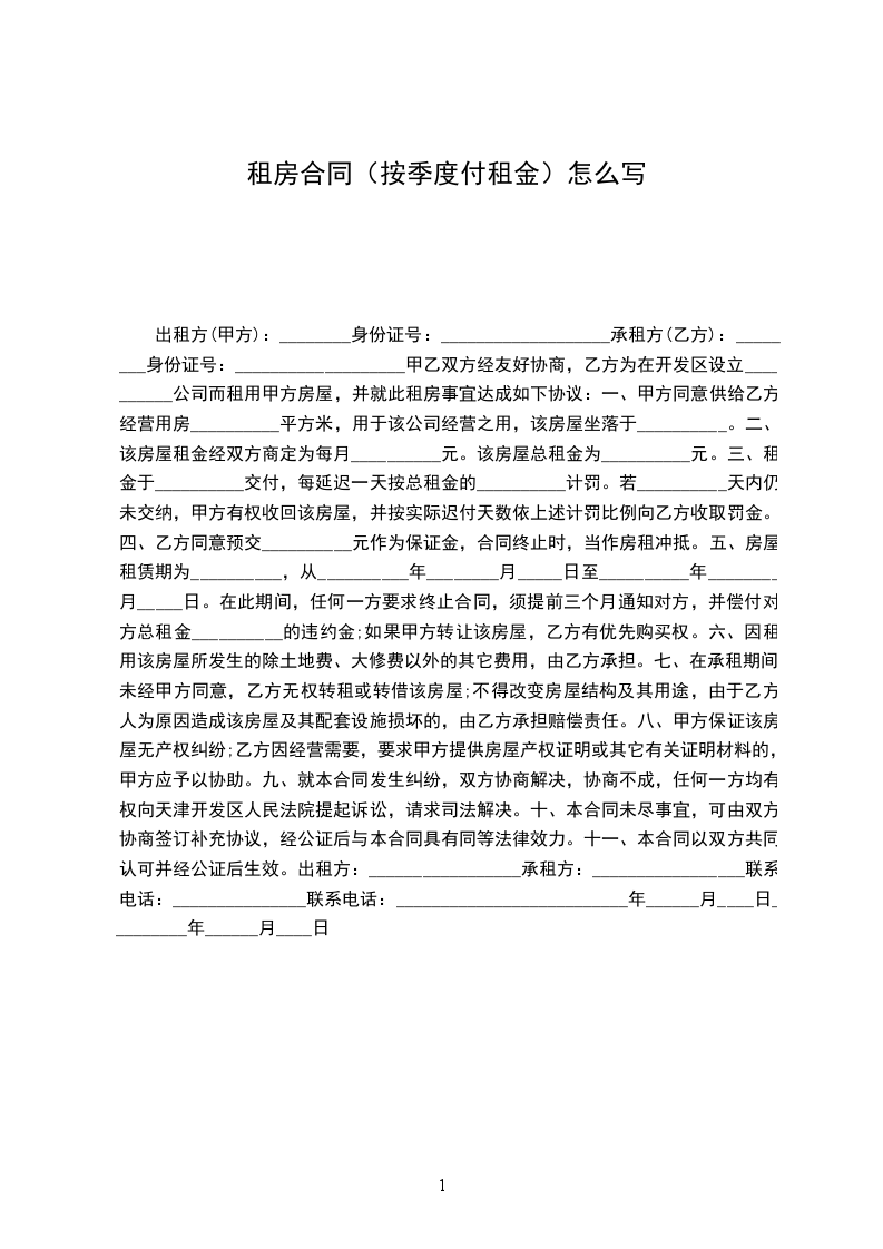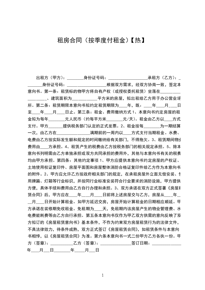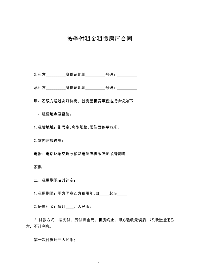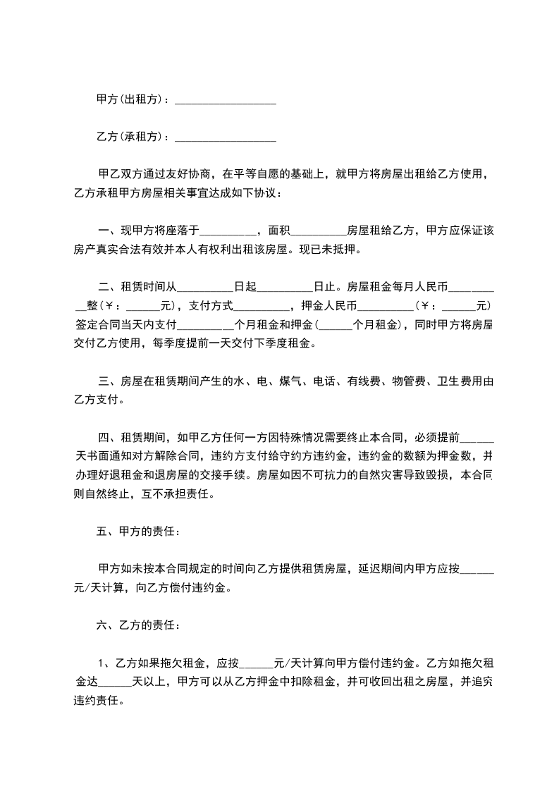 本房屋月租金为人民币______元,按月/季度/年结算。每月月初/每季季初/每年年初X日内,乙方向甲方支付全月/季/年租金。