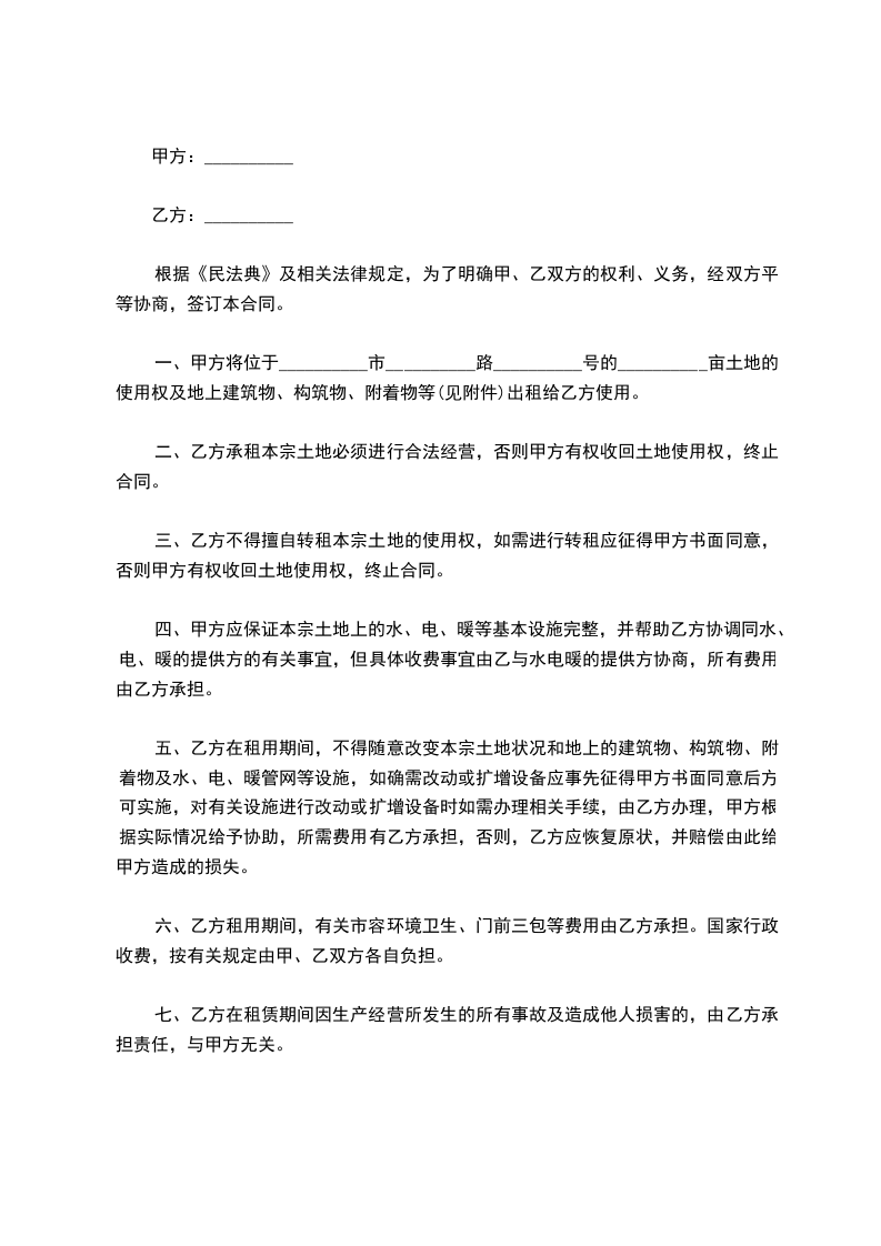 一、甲方将位于__________市__________路__________号的__________亩土地的使用权及地上建筑物、构筑物、附着物等(见附件)出租给乙方使用。