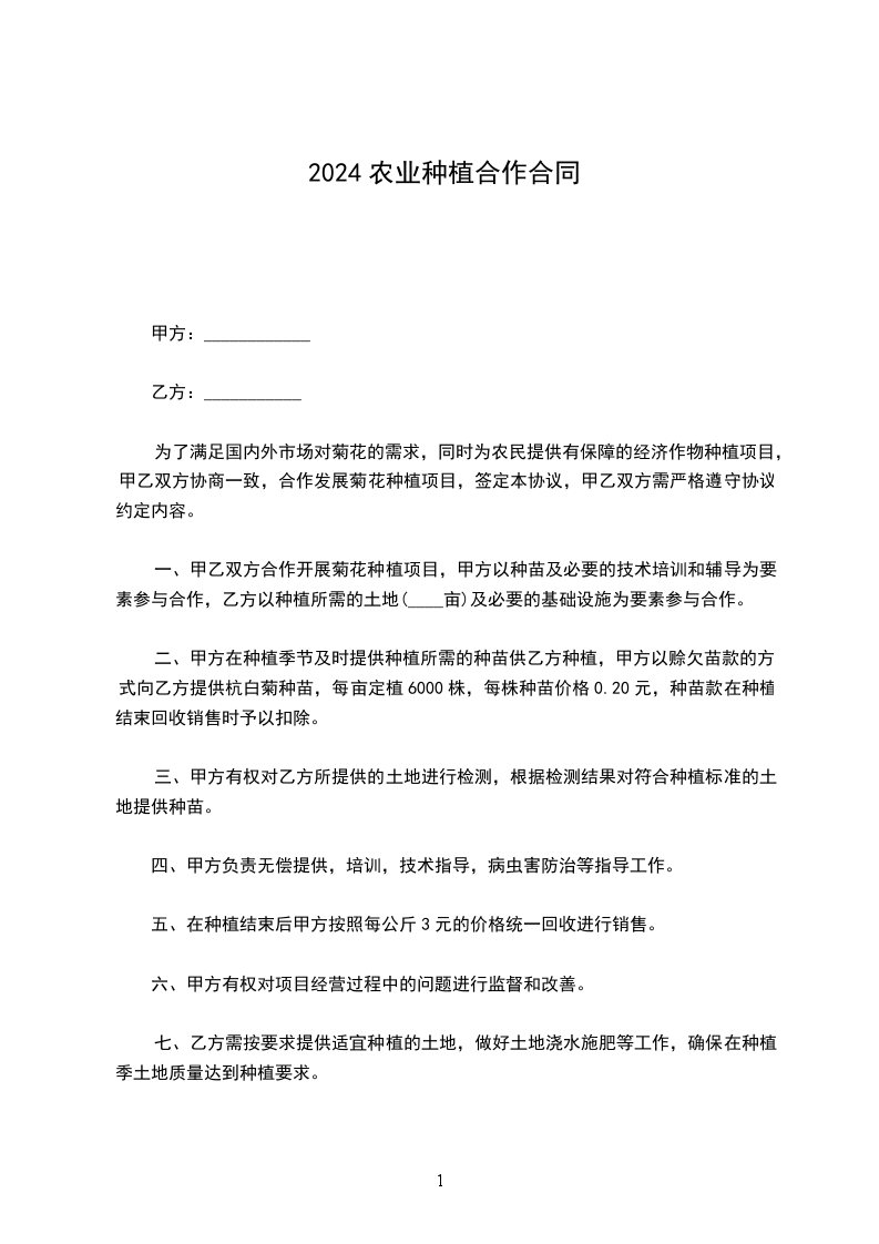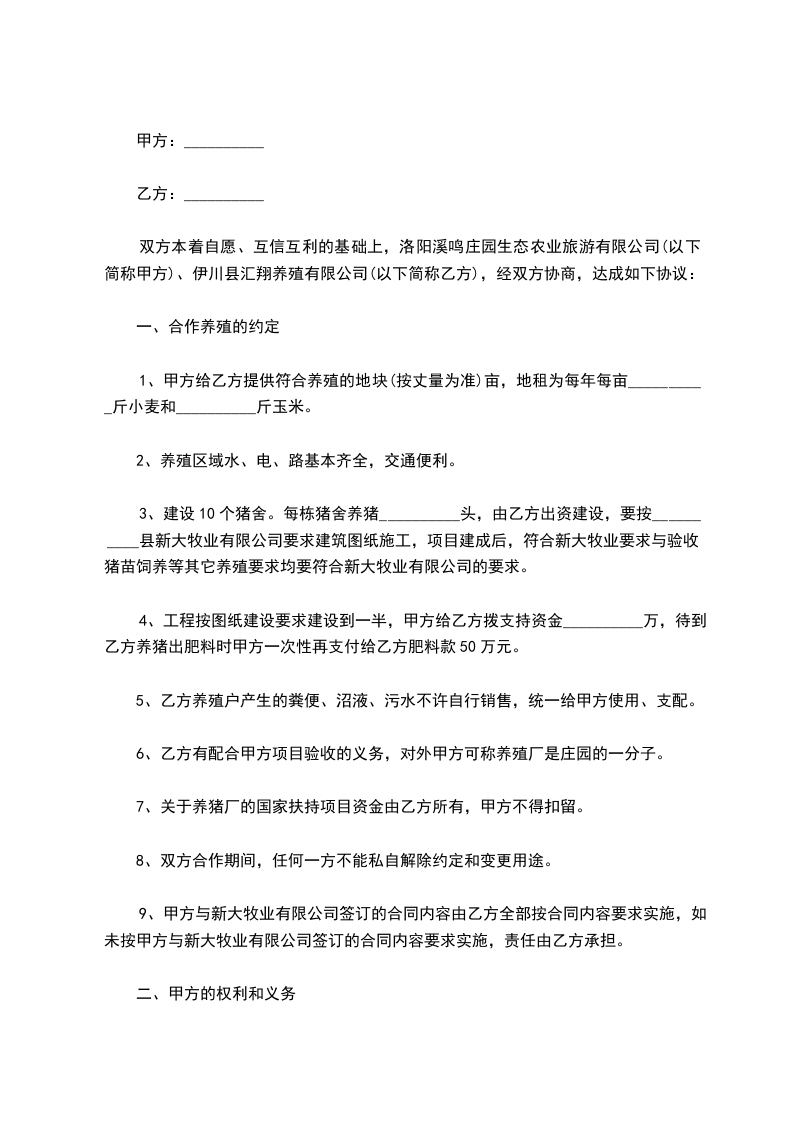 1、甲方给乙方提供符合养殖的地块(按丈量为准)亩,地租为每年每亩__________斤小麦和__________斤玉米。