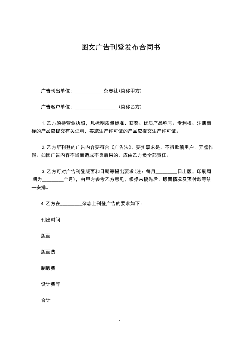 3.乙方可对广告刊登版面和日期等提出要求(注:每月_________日出版,印刷周期为_________个月),由甲方参考乙方意见,根据来稿先后、版面情况及预付款等统一安排。