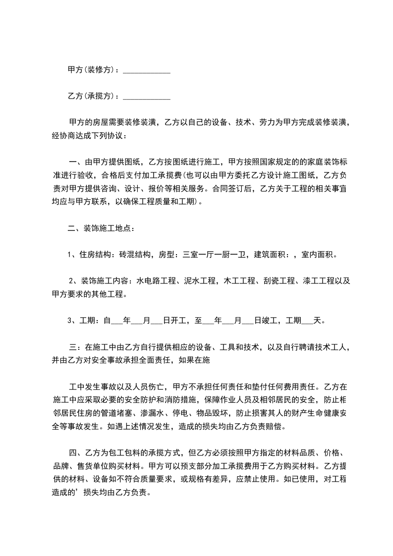 一、由甲方提供图纸,乙方按图纸进行施工,甲方按照国家规定的的家庭装饰标准进行验收,合格后支付加工承揽费(也可以由甲方委托乙方设计施工图纸,乙方负责对甲方提供咨询、设计、报价等相关服务。合同签订后,乙方关于工程的相关事宜均应与甲方联系,以确保工程质量和工期)。
